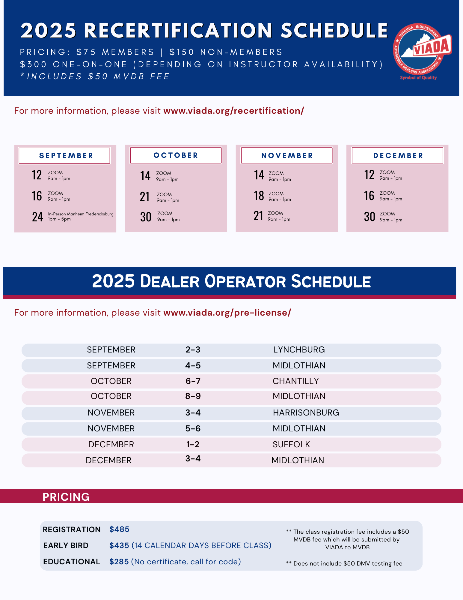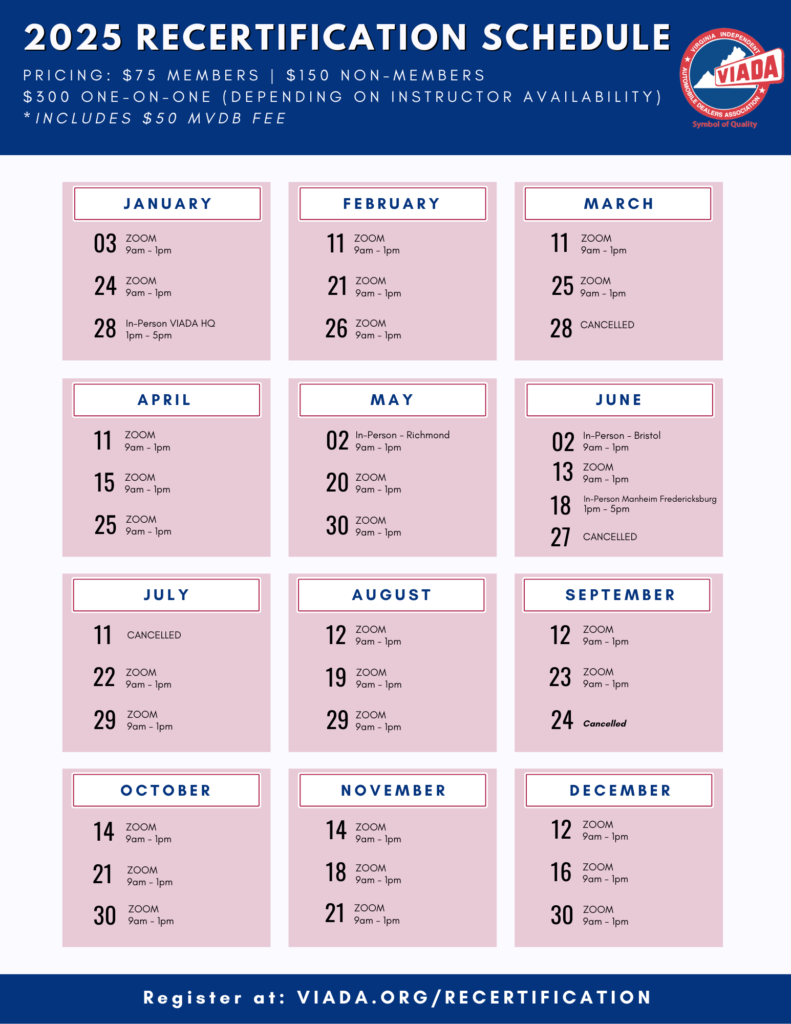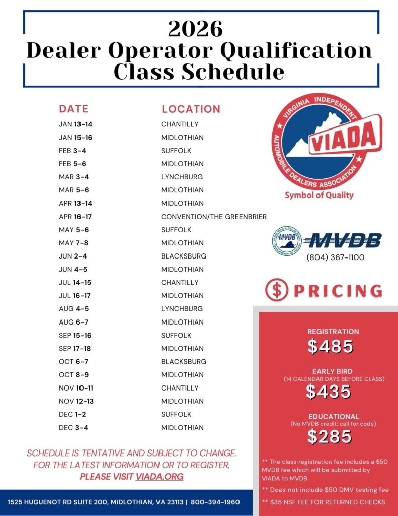 The Virginia Independent Automobile Dealers Association (VIADA) presents the two-day course at locations throughout the state and is taught by former dealers who have over 40+ years of experience combined.
